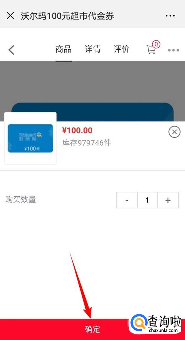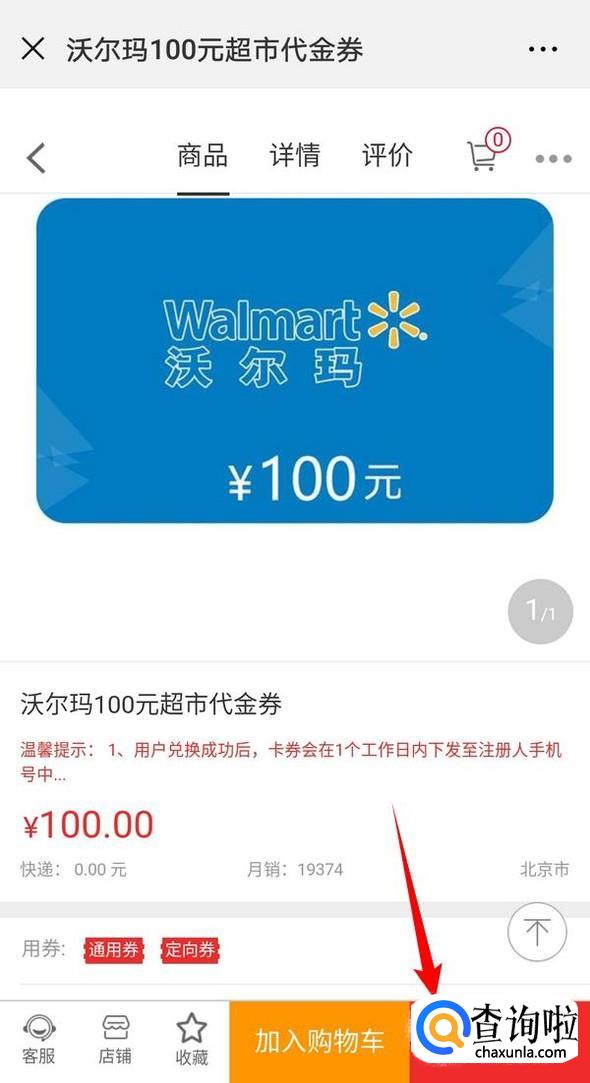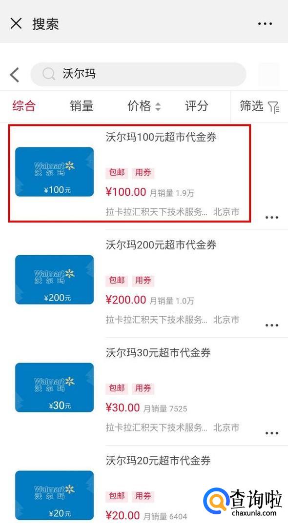 在搜索框中输入沃尔玛,搜索出沃尔玛的代金券,这里选择100元的代金券作为演示;