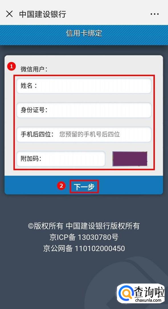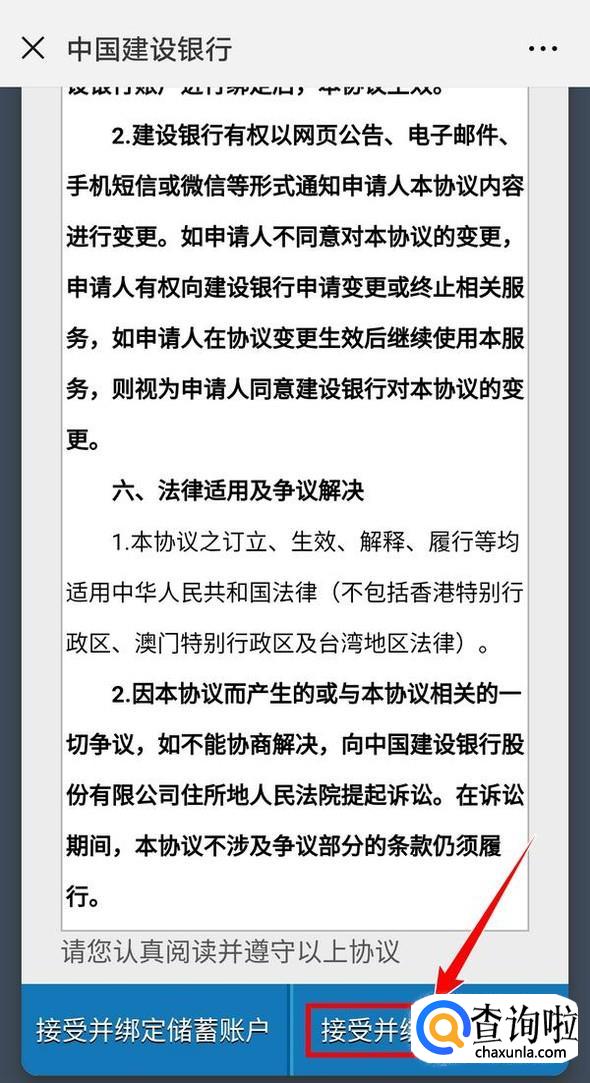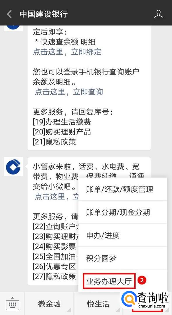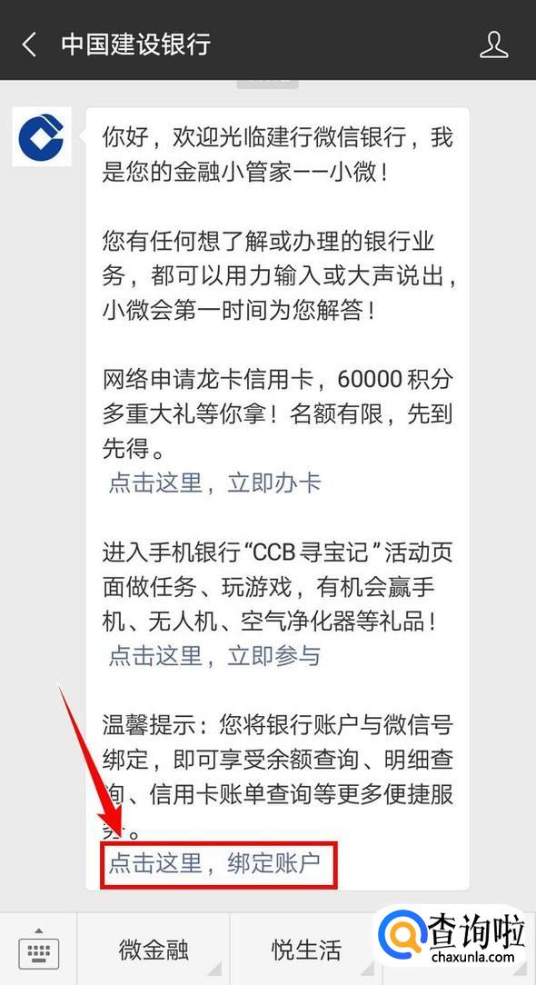 首先微信关注建设银行的公众号,在弹出的消息中点击“点击这里,绑定账户”,根据提示,填写要求的信息,绑定信用卡;