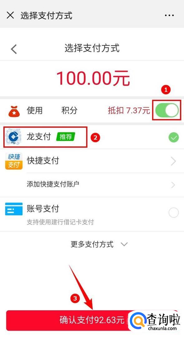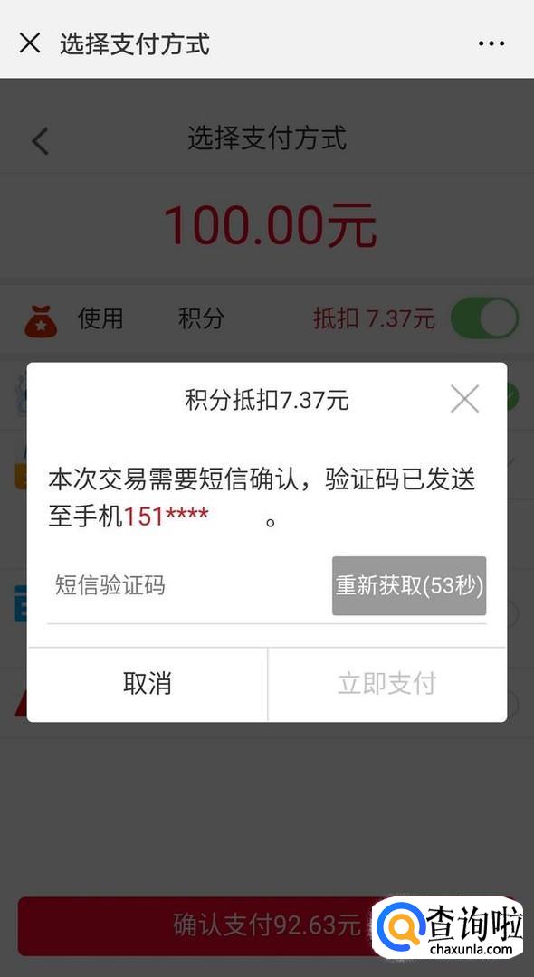 到支付页面,打开积分抵扣开关,不足部分需要信用卡支付,最后点击确认支付,输入验证码即可;