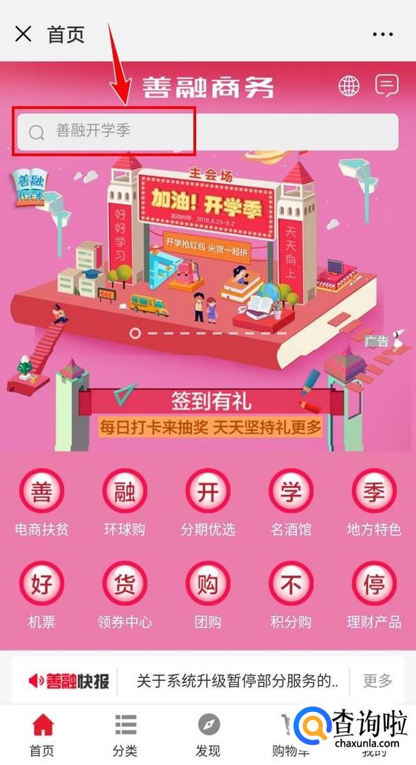 悦生活菜单下,点击“粉丝福利/善融商城”,在打开页面中点击搜索框;