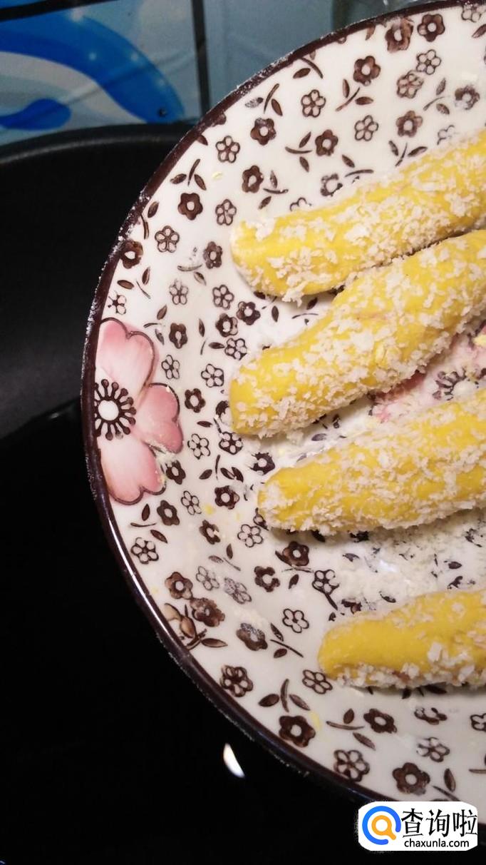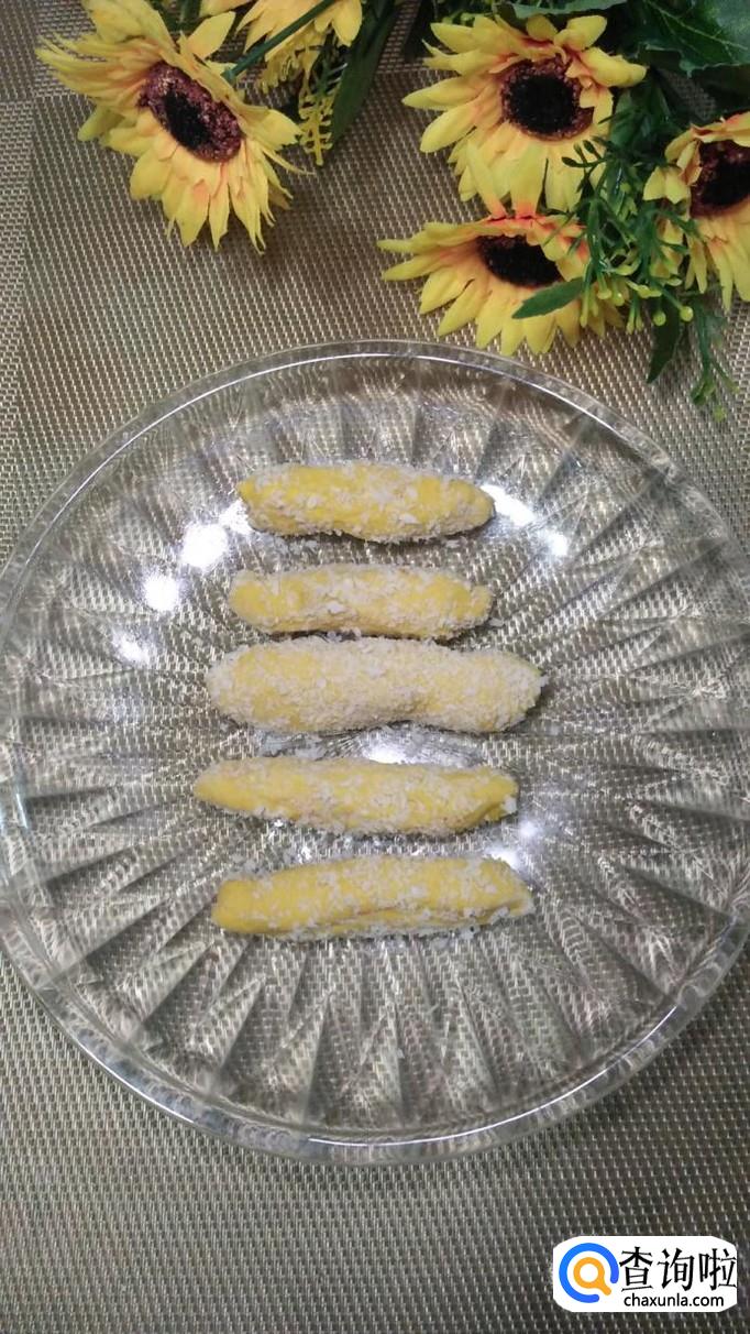 不用加水,和成面团,搓成长条,如图所示,再均匀的沾上一层面包糠,放入盘中备用。