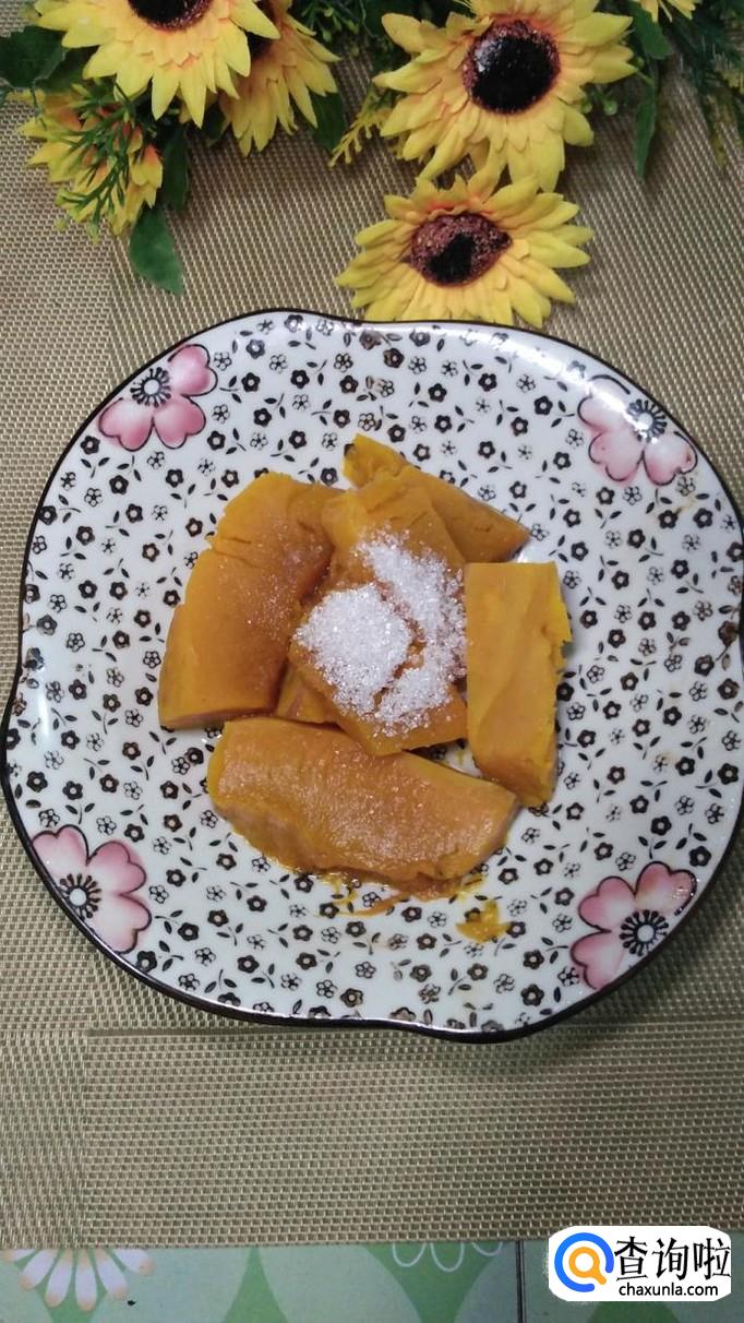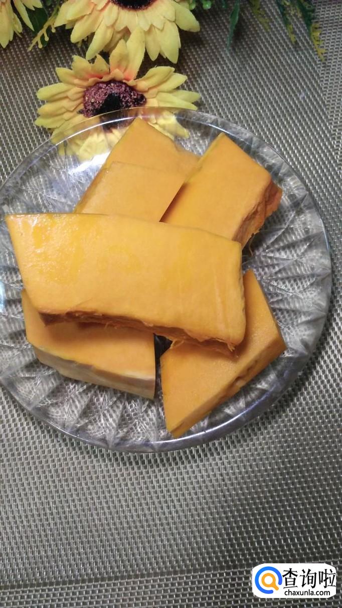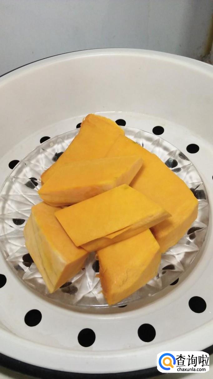 准备新鲜的南瓜,去皮洗净,切成小块,放入蒸锅中蒸20分钟。南瓜比较容易熟,可以用筷子扎一下,如果很容易就扎破,说明蒸熟了。
