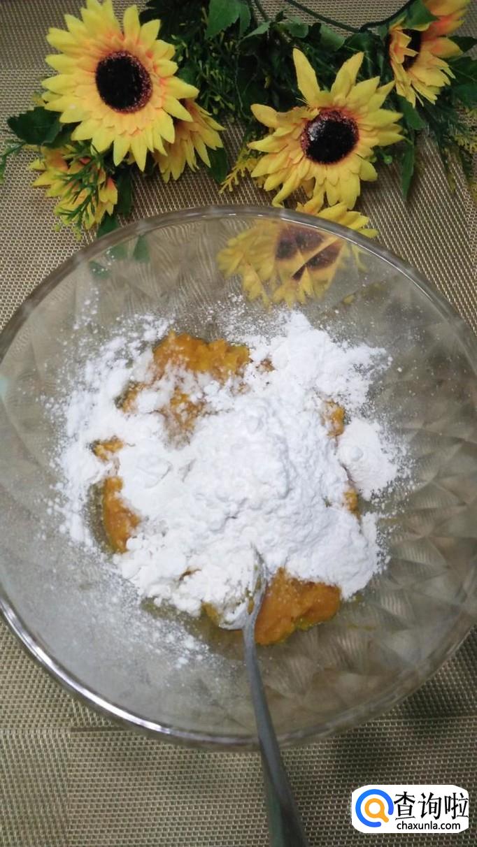 将蒸好的南瓜取出,放入盘中,再加入适量的白砂糖,压成泥。南瓜本身含有大量的糖分,白砂糖不用加太多,可以根据自己的口味进行添加。