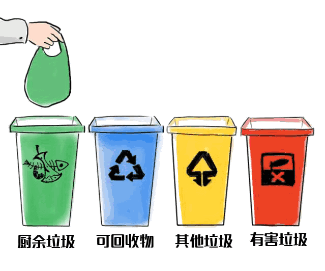 据国家制定的统一标志,生活垃圾被划分为四类,它们分别是可回收垃圾、厨余垃圾、有害垃圾和其他垃圾。