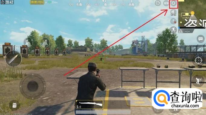 进入训练场后,分别拾取武器以及8倍镜,点击右上角小地图左侧的“设置”选项。