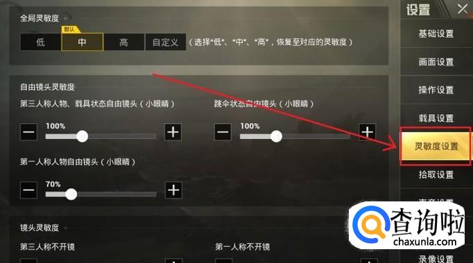在设置中心右侧的列表中,点击进入“灵敏度设置”界面。