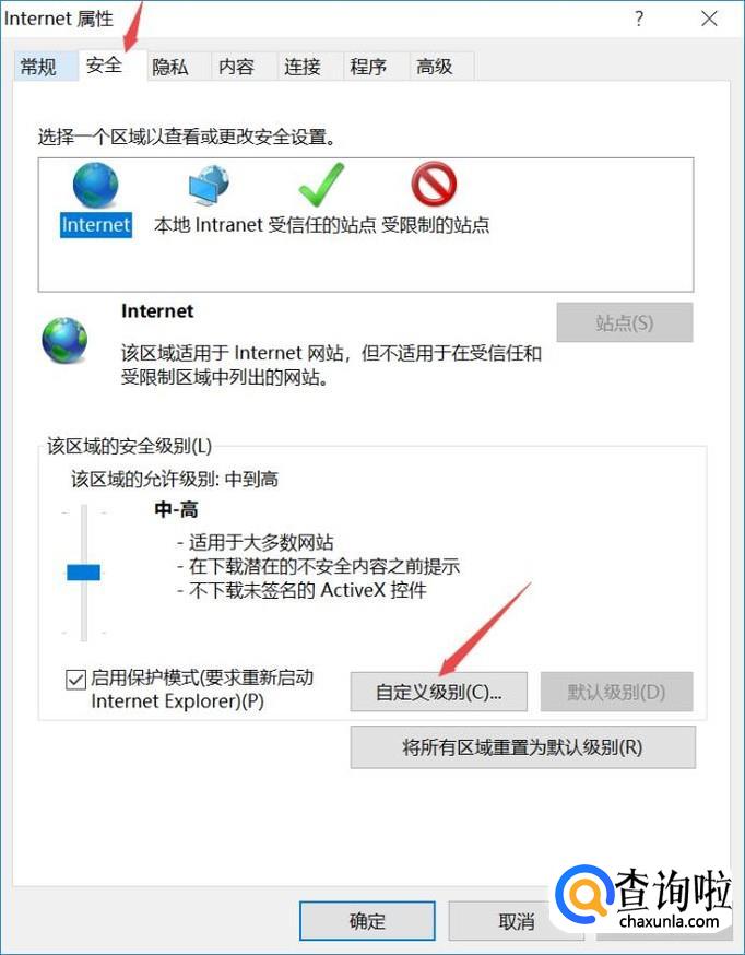 在出来的窗口中点击“安全”找到“自定义级别”按钮。