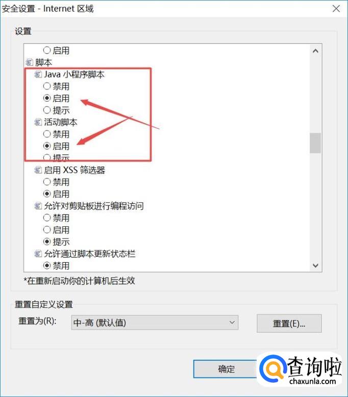 在自定义级别中找到“脚本”选项,我们直接设置成为启用javascript,选择完成之后点击下方的确定按钮,重启一下浏览器就设置成功了。