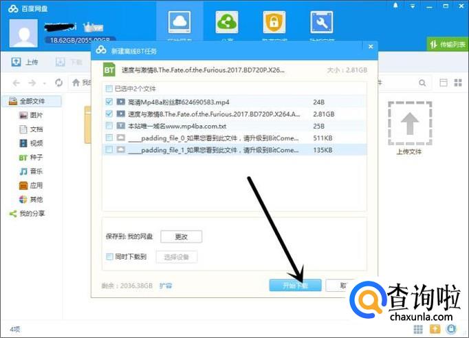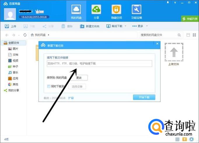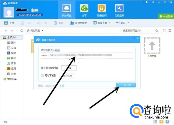 在离线下载框中粘贴之前复制的磁力链接,然后点击 开始下载