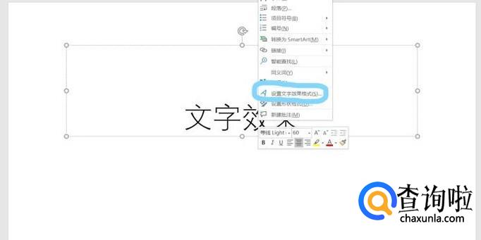 在想要设置文字效果的字体上单击鼠标右键,在出现的菜单中选择“设置文字效果格式”,单机鼠标左键