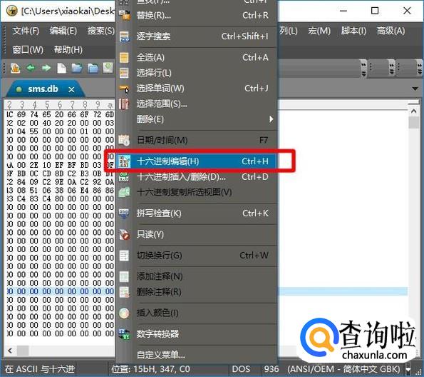 在窗口上的文字编辑区域右击,再点击“十六进制编辑”菜单。
