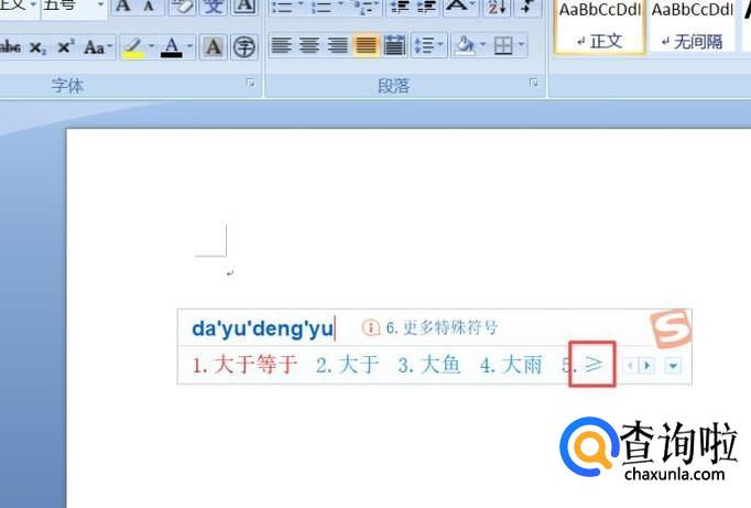然后我们在word中输入大于等于符号,我们电脑上如果安装的是搜狗输入法的话,那么是很多简单的,我们输入dayudengyu,我们可以看到第五个就是大于等于符号了,我们点击它;