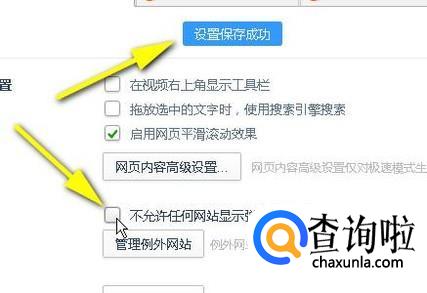 在右边即弹出高级设置各个选项。如下图中所示,鼠标点击一下小方框。把绿色的对勾取消。取消对勾后,即时显示出设置保存成功。