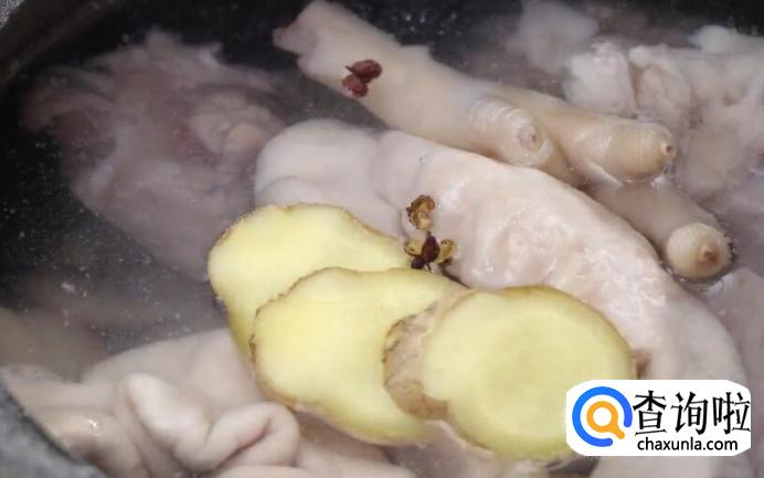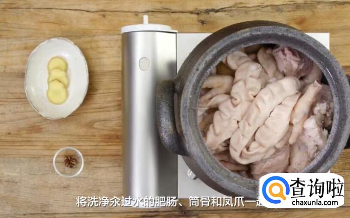 然后处理肥肠。最后选择带肠头的肥肠,将洗净汆过水的肥肠、筒骨和凤爪一起放入炖锅。