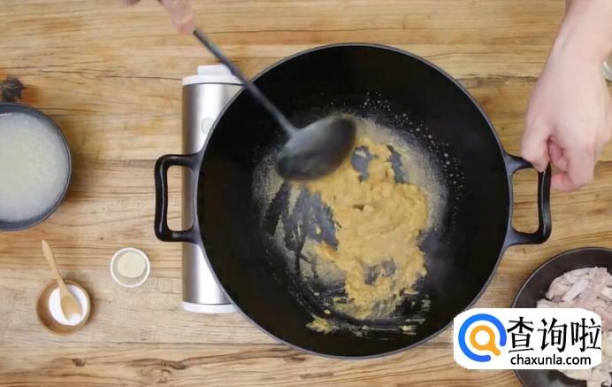 油化开后,放姜片煸香。再倒入耙豌豆翻炒出香。