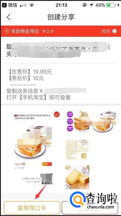 分享的时候再点击左下角选择复制淘口令,复制淘口令后打开淘宝直接下单即可,确认收货后就能够获得相对应的返利。