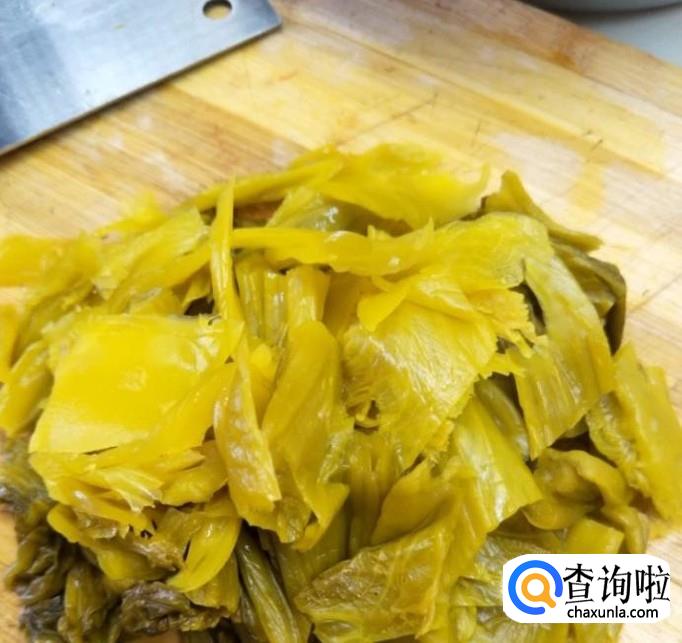 然后我们将准备好的酸菜切成块,放入凉水中冲洗干净,放入热水锅中焯一下,捞出沥干水分备用
