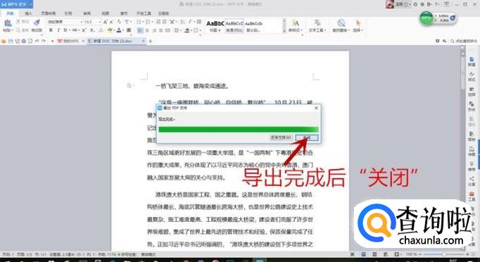 导出PDF完成后会出现对话框,点击“打开文件”即可查看新生成的PDF文档。这里我们为了让您更清楚地了解选择“关闭”,之后再打开。