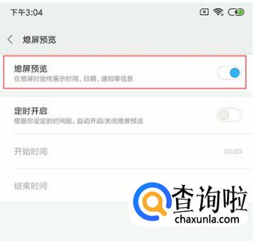 开启息屏预览后面的开关,即可显示时间、日期、通知等信息。还可设置定时开启,自动开启/关闭息屏预览。