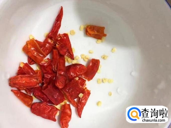 干红辣椒切成小段,辣椒籽按个人喜好去掉或者留用。