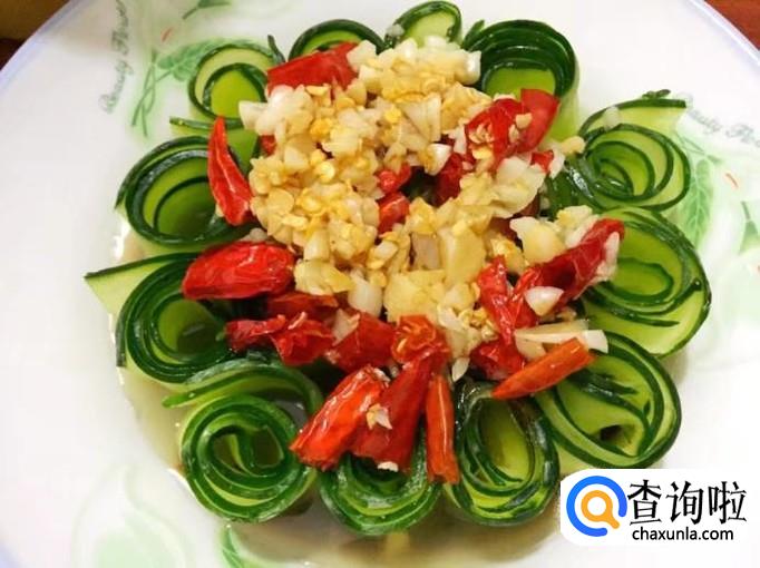 锅内倒入适量的食用油烧热后,倒进切好的蒜末和干红辣椒炒香,然后连同热油一起淋在摆盘好的青瓜卷上。
