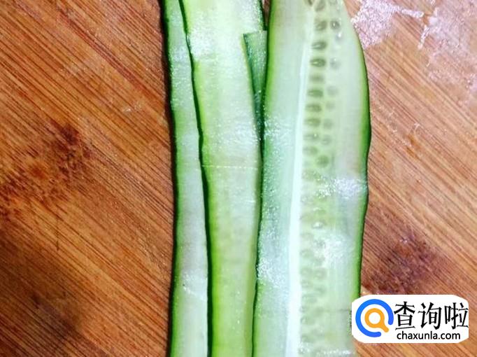 用刨子直接从青瓜的一头刨到另一头呈长条的薄片状,如图。