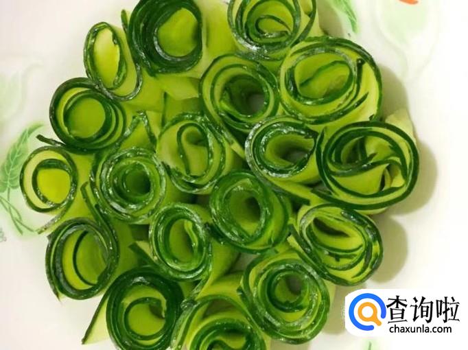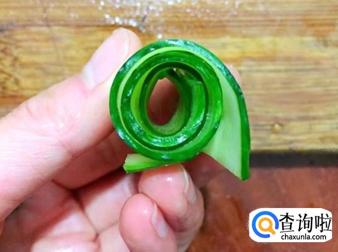 把青瓜全部刨成片后,再把青瓜片卷成卷状,如图。我是两片青瓜片一起卷的,青瓜卷会大一些,容易摆盘。