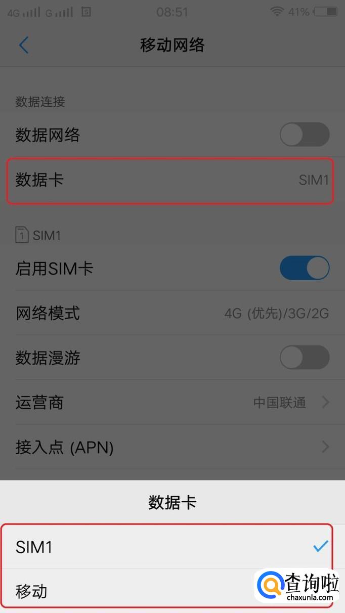 点击“数据卡”,设置平时使用手机流量时,用哪个卡的流量。