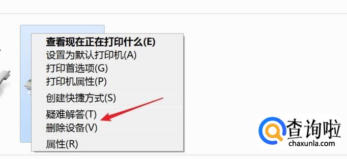打开后,右键点击出问题的打印机,选择‘删除设备’