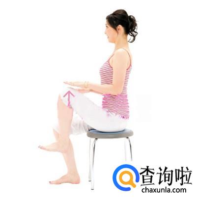 双腿屈膝坐在椅子上,上身往上提拉,腰背挺直,腹部肌肉收紧,带靠背的椅子尽量不要挨着哦,两腿并拢,手臂屈肘,抬起下臂,并与地面平衡。左右脚交替地抬起,脚掌保持向下,膝盖抬至与下臂同高的位置,并且与手掌触碰,左右各重复5个来回,刺激大腿整体的肌肉。