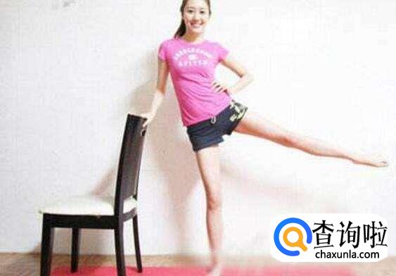 可以借助椅子,扶着椅子站直,将左腿向左往上抬尽可能成90度。进行拉升。腿部前侧及后侧的肌群,同时拉伸美化肌肉线条,达到大腿减脂的效果。