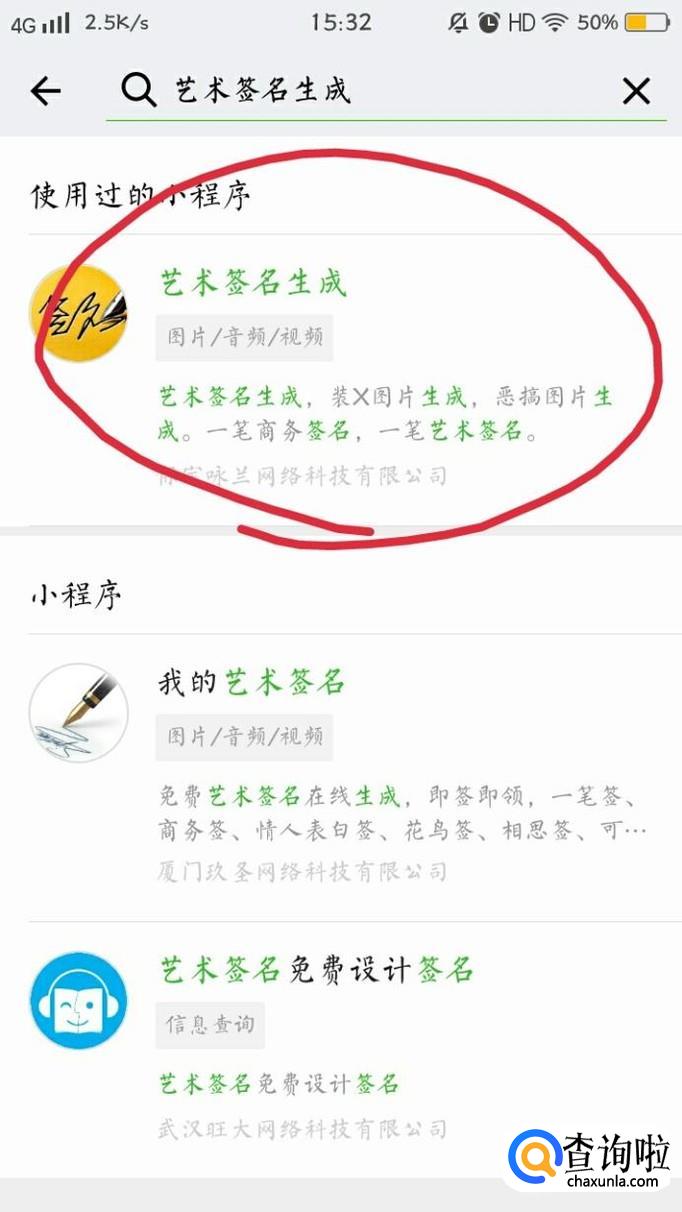 然后选择出现的第一个小程序“艺术签名生成”。如下图所示。