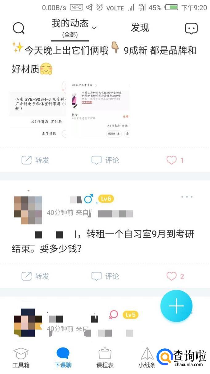“下课聊”主要是和同校好友交流的地方,你可以发送动态,也可以浏览本校同学发表的动态,和他们进行交流。