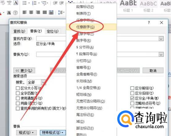 将光标定在“查找”搜索栏中,点击“更多”,找到“特殊格式”,然后选择“任意数字”,如图所示。
