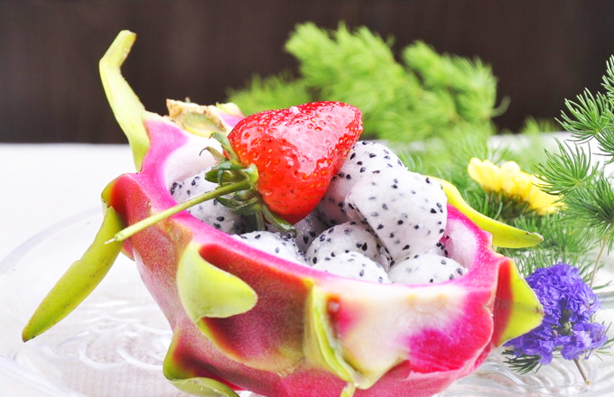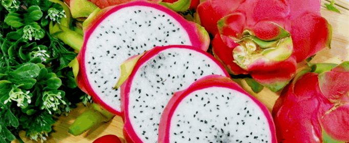 红心火龙果的颜色为紫红色,这是因为果肉中含有丰富的花青素和胡萝卜素,比白心火龙果的含量要高很多,花青素具有抗氧化、抗自由基的作用,而胡萝卜素有提高免疫力、保护眼睛的作用。