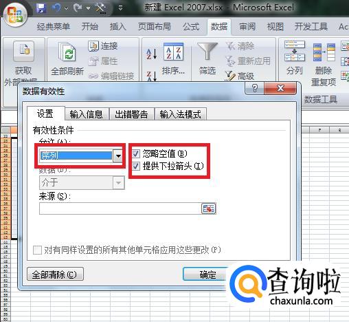 然后在出现的窗口中,在允许的下拉窗口中,选择序列,勾选“提供下拉箭头”选项。