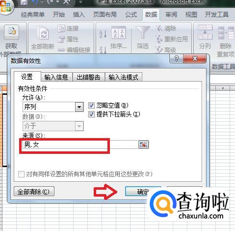 然后在来源的栏中输入“男,女”,点击确定按钮。