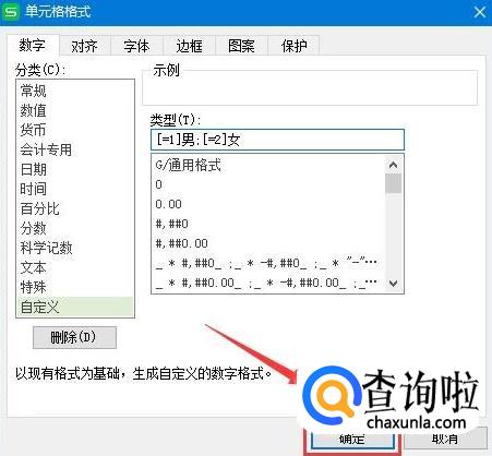 右击区域,选中【设置单元格格式】,选择【自定义】,类型区域输入:[=1]男;[=2]女,点击【确定】。