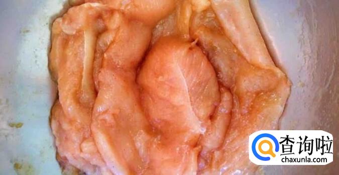 首先准备好新鲜的鸡胸脯肉洗干净,然后用菜刀从侧面对半剖开不切断。接着把肉质敲打松散,让鸡肉变大变薄。