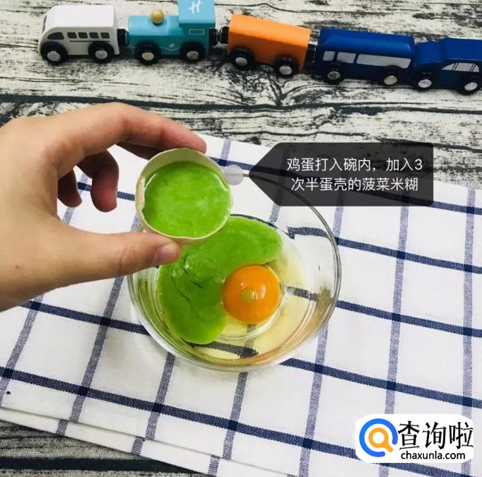 然后将一颗鸡蛋打入碗中,加入1.5个鸡蛋量的菠菜米糊,搅拌均匀,如下图所示。