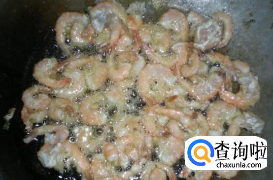 油锅中倒入植物油,开大火,待油烧至5成热,倒入河虾油炸,然后迅速捞出;油温升到7成热时,再次油炸河虾,也需快速捞出,油炸时间不宜过长