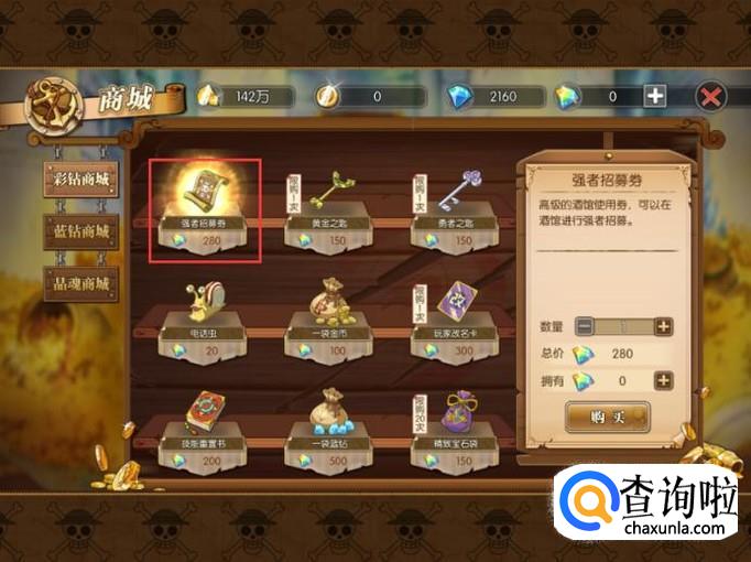 如果玩家有彩钻,此时可以在【彩钻商城】页面花费280彩钻购买获得强者招募券。