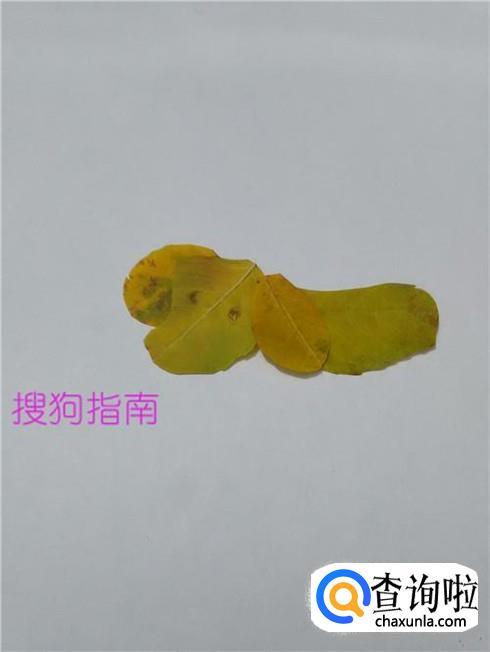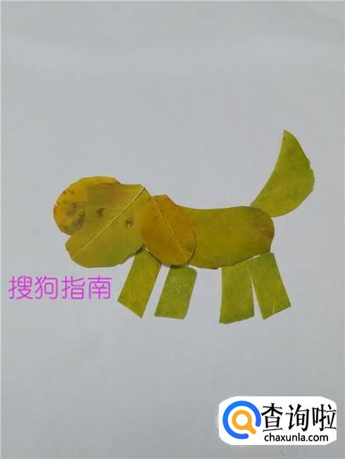 再将一片叶子剪去一侧的边儿,粘在狗头右侧,当做身体。
