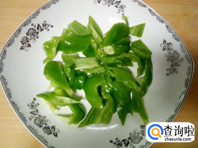 青椒用水清洗干净,控干水分,切成片。
