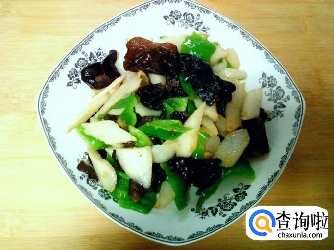 炒至木耳变软,透明,放入青椒翻炒,放入盐。炒至青椒断生,放入少许味精,关火出勺。