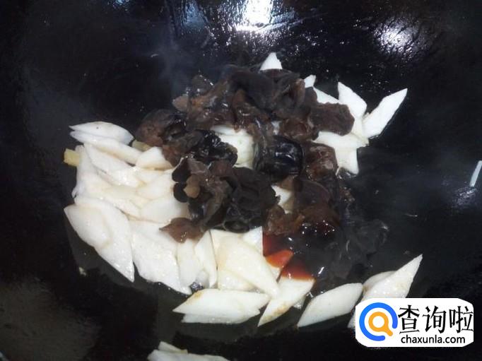 山药略翻炒一下,放入木耳翻炒,放入一小匙儿蚝油。