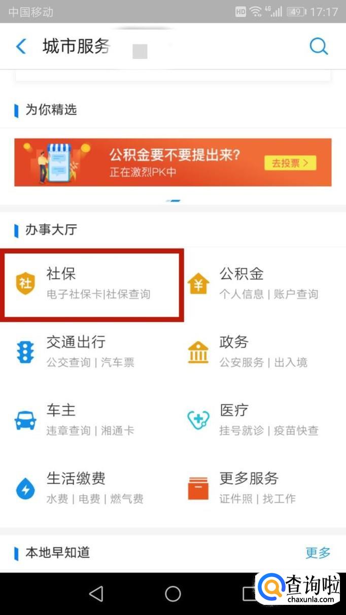 在”城市服务“里面,选择”社保“进入。