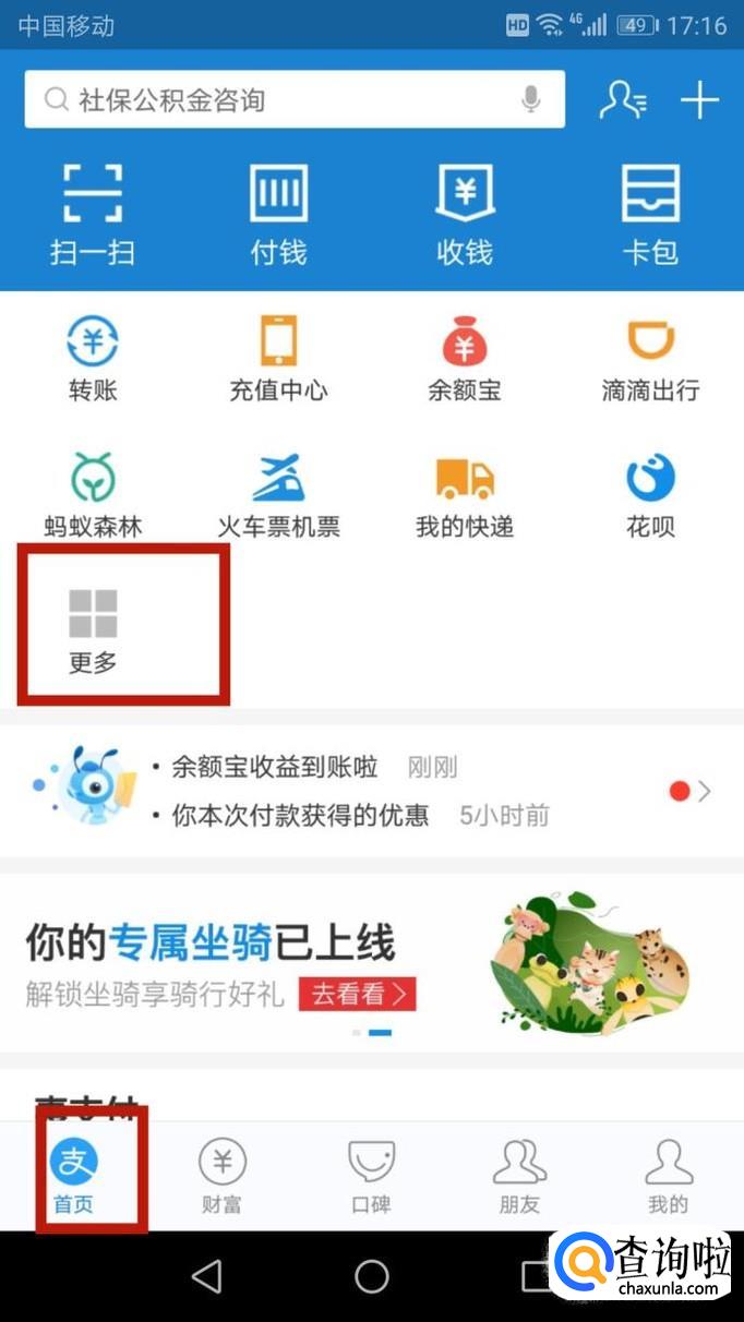 首先,进入支付宝,登陆个人信息后,从首页的”更多“进入。