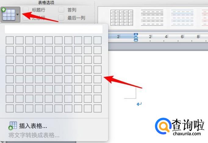 然后点击左边的表格选项,在下拉里用鼠标划过上面的格子,来选择插入的表格是几行几列的。