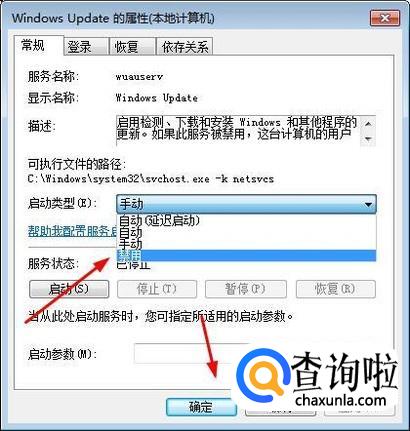 然后我们在“启动类型”列表选择“禁用”然后确定退出就设置完成。以后就不会出现提示更新了。